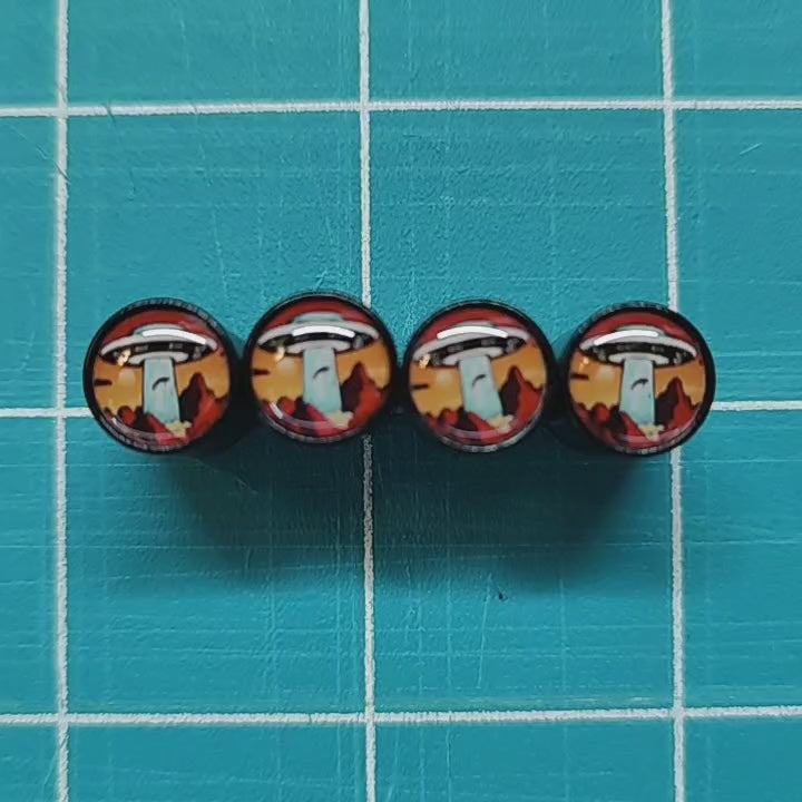 UFO Alien Abduction Tire Valve Caps - Black Aluminum - Set of Four