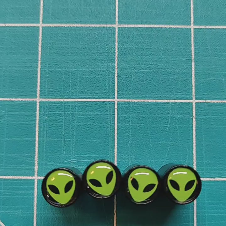 Aliens are coming! Add a cosmic touch to your vehicle with these Alien Face Tire Valve Caps! Made of aluminum and black coated, these valve caps are rustproof and fit any Schrader valve stem (Universal). They also have an internal neoprene o-ring to protect your valve stem. With five alien colors available, you can choose the perfect set to match your car. They are easy to install and perfect for any vehicle. Need alien gifts? These make a great gift for any alien fan.