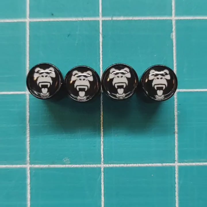 Watch out, there's been a gorilla sighting! Check out these brand new Angry Gorilla Ape (Style 3) Tire Valve Caps - Black Aluminum - Set of Four. These angry gorilla valve caps are designed to fit any Schrader valve stem (Universal) and feature an internal neoprene o-ring to protect your valve stem. Crafted from aluminum and black coated, these angry ape valve caps are rustproof and durable. These angry gorilla valve caps are easy to install and look great on any wheel. Need gorilla gifts? These angry ape valve caps make a great gift for any gorilla lover.