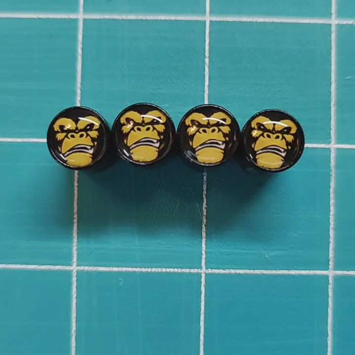 Watch out, there's been a gorilla sighting! Check out these brand new Angry Gorilla Ape (Style 4) Tire Valve Caps - Black Aluminum - Set of Four. These angry gorilla valve caps are designed to fit any Schrader valve stem (Universal) and feature an internal neoprene o-ring to protect your valve stem. Crafted from aluminum and black coated, these angry ape valve caps are rustproof and durable. These angry gorilla valve caps are easy to install and look great on any wheel. Need gorilla gifts? These angry ape valve caps make a great gift for any gorilla lover.