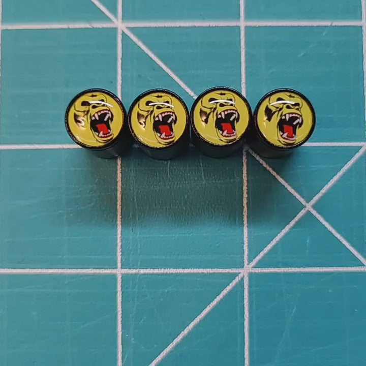 Watch out, there's been a gorilla sighting! Check out these brand new Angry Gorilla Ape (Style 7) Tire Valve Caps - Black Aluminum - Set of Four. These angry gorilla valve caps are designed to fit any Schrader valve stem (Universal) and feature an internal neoprene o-ring to protect your valve stem. Crafted from aluminum and black coated, these angry ape valve caps are rustproof and durable. These angry gorilla valve caps are easy to install and look great on any wheel. Need gorilla gifts? These angry ape valve caps make a great gift for any gorilla lover.