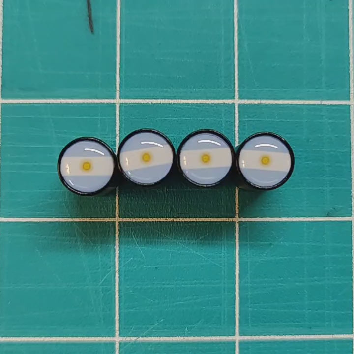 These are brand new Argentina Flag Tire Valve Caps - Black Aluminum - Set of Four. They are made to fit any Schrader valve stem (Universal), they fit on all vehicles. These Argentina Flag Valve Caps have an internal neoprene o-ring to protect your valve stem. Made of aluminum, black coated. Valve caps are rustproof. They are easy to install and perfect for any vehicle. Need a Argentina Flag gift? These Argentinian Valve Caps make a great gift for anyone who loves Argentina!
