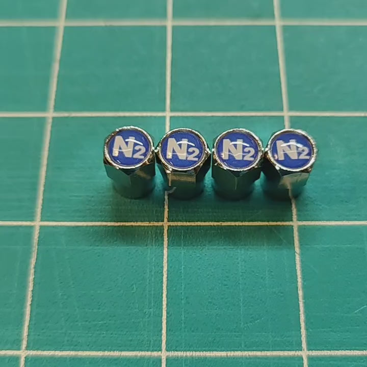 These are brand new Blue N2 Nitrogen Tire Valve Caps (Style 1) - Chrome Coated - Universal. They are made to fit any Schrader valve stem (Universal), they fit on all vehicles. Available in 4pk, 8pk, 12pk, and 20pk. These blue n2 nitrogen valve caps have an internal neoprene o-ring to protect your valve stem. Made of brass alloy, chrome coated. Valve caps are rustproof. These blue n2 nitrogen valve caps are easy to install and look great on any wheel. Need n2 nitrogen gifts? These blue n2 nitrogen tire valve caps make a great gift for any n2 nitrogen fan.