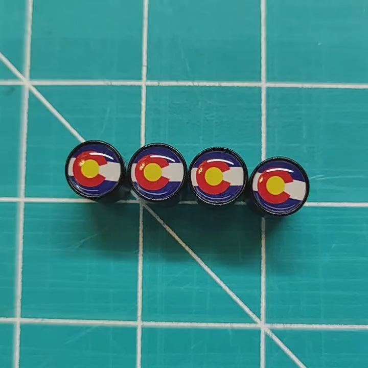 These are brand new Colorado Flag Tire Valve Stem Caps - Black Aluminum - Set of Four. They are made to fit any Schrader valve stem (Universal), they fit on all vehicles. These Colorado Flag Valve Caps have an internal neoprene o-ring to protect your valve stem. Made of aluminum, black coated. Valve caps are rustproof. They are easy to install and perfect for any vehicle. Need Colorado gifts? These Colorado Flag Valve Caps make a great gift for anyone who loves Colorado!