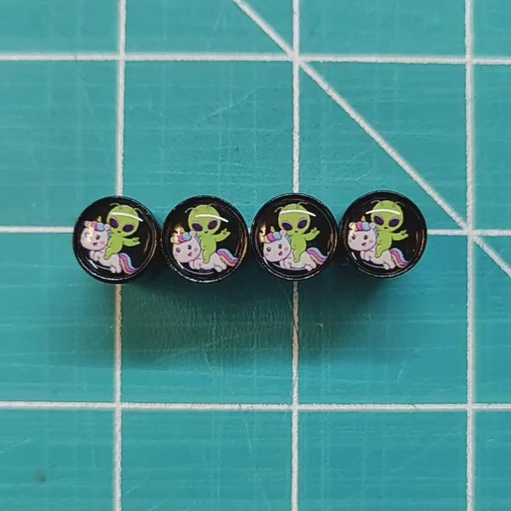 These are brand new Cute Alien on Unicorn Tire Valve Stem Caps - Black Aluminum - Set of Four. They are made to fit any Schrader valve stem (Universal), they fit on all vehicles. These cute alien on unicorn tire valve caps have an internal neoprene o-ring to protect your valve stem. These valve caps are made of aluminum and black coated. They are rustproof. These cute alien tire valve caps are easy to install and look great on any wheel. They make great gifts too!