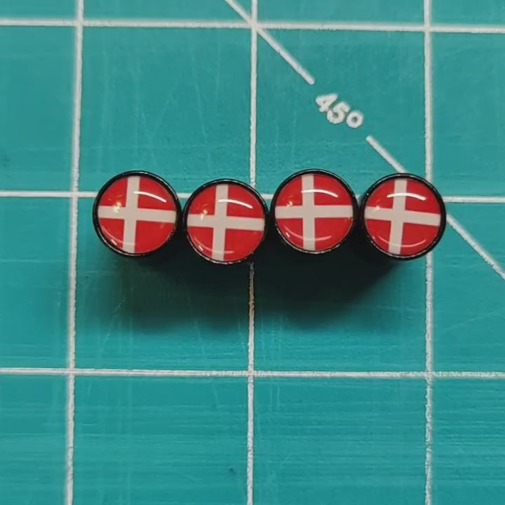These are brand new Denmark Flag Tire Valve Stem Caps - Black Aluminum - Set of Four. They are made to fit any Schrader valve stem (Universal), they fit on all vehicles. These Denmark Flag Valve Caps have an internal neoprene o-ring to protect your valve stem. Made of aluminum, black coated. Valve caps are rustproof. They are easy to install and perfect for any vehicle. Need Denmark gifts? These Danish Valve Caps make a great gift for anyone who loves Denmark!