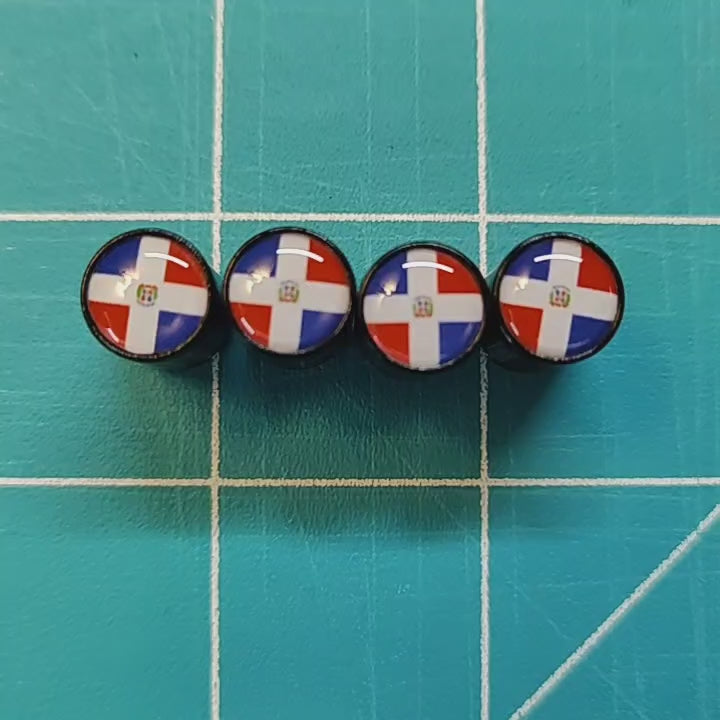 These are brand new Dominican Republic Flag Tire Valve Stem Caps - Black Aluminum - Set of Four. They are made to fit any Schrader valve stem (Universal), they fit on all vehicles. These Dominican Republic Valve Caps have an internal neoprene o-ring to protect your valve stem. Made of aluminum, black coated. Valve caps are rustproof. They are easy to install and perfect for any vehicle. Need Dominican gifts? These Dominican Valve Caps make a great gift for anyone who loves Dominican Republic!