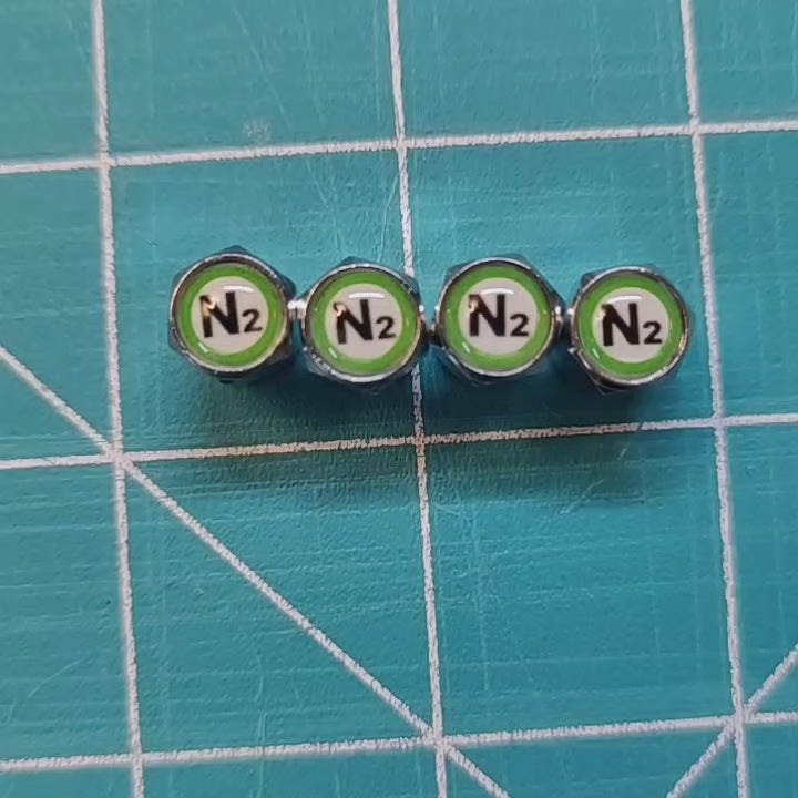These are brand new Green N2 Nitrogen Tire Valve Caps (Style 2) - Chrome Coated - Universal. They are made to fit any Schrader valve stem (Universal), they fit on all vehicles. Available in 4pk, 8pk, 12pk, and 20pk. These green n2 nitrogen valve caps have an internal neoprene o-ring to protect your valve stem. Made of brass alloy, chrome coated. Valve caps are rustproof. These green n2 nitrogen valve caps are easy to install and look great on any wheel. Need n2 nitrogen gifts? These green n2 nitrogen tire valve caps make a great gift for any n2 nitrogen fan.