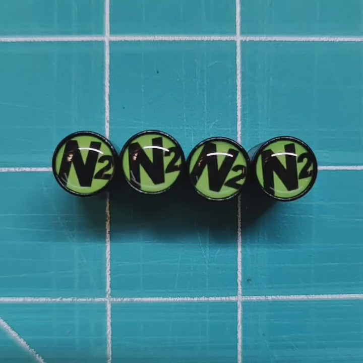 These are brand new Green with Black N2 Nitrogen Tire Valve Caps - Black Aluminum - Universal. They are made to fit any Schrader valve stem (Universal), they fit on all vehicles. Available in 4pk, 8pk, 12pk, and 20pk. These green with black n2 nitrogen valve caps have an internal neoprene o-ring to protect your valve stem. Made of aluminum, black coated. Valve caps are rustproof. These green with black n2 nitrogen valve caps are easy to install and look great on any wheel. Need n2 nitrogen gifts? These green with black n2 nitrogen tire valve caps make a great gift for any n2 nitrogen fan.