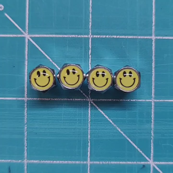 Put on a smiley face! These brand new Happy Smiley Face Tire Valve Stem Caps are perfect for any vehicle. These Smiling Face Tire Valve Caps are designed to fit any Schrader valve stem (Universal) and feature an internal neoprene o-ring to protect your valve stem. Crafted from brass alloy and chrome coated, these Happy Smiley Face Tire Valve Caps are rustproof and durable. With their Smiley Face design, they are sure to stand out. They are easy to install and perfect for any vehicle. Need a smiley gifts? These make a great gift for any big smiley face fan. A must have for anyone looking to get smiley!