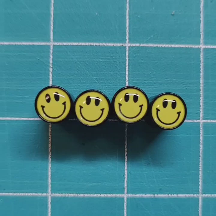 Put on a smiley face! These brand new Happy Smiley Face Tire Valve Stem Caps are perfect for any vehicle. These Smiling Face Tire Valve Caps are designed to fit any Schrader valve stem (Universal) and feature an internal neoprene o-ring to protect your valve stem. Crafted from aluminum and black coated, these Happy Smiley Face Tire Valve Caps are rustproof and durable. With their Smiley Face design, they are sure to stand out. They are easy to install and perfect for any vehicle. Need a smiley gifts? These make a great gift for any big smiley face fan. A must have for anyone looking to get smiley!