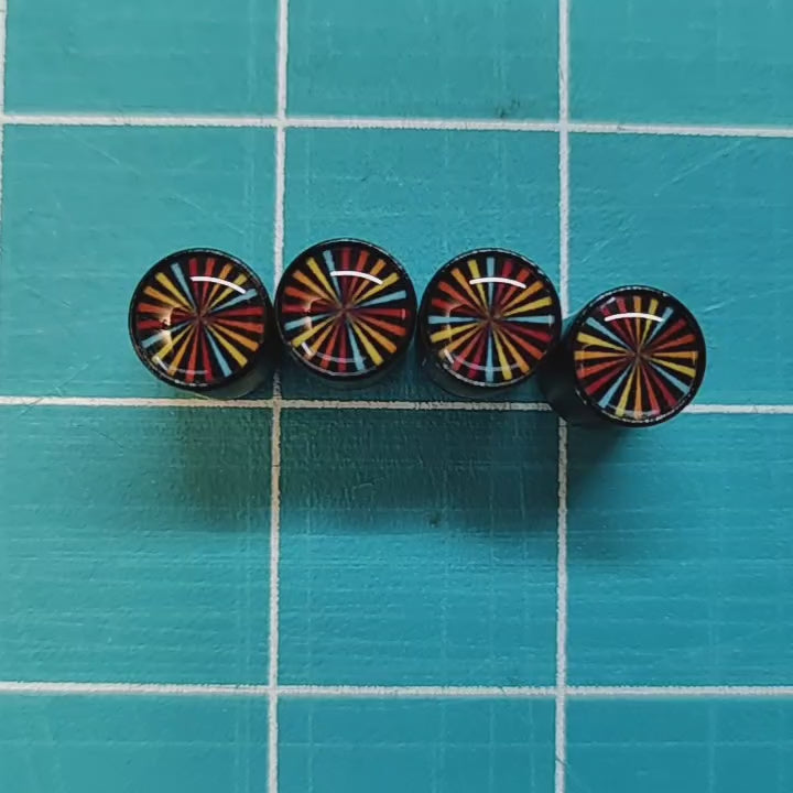 These are brand new Pattern Design (Style 1) Tire Valve Caps - Black Aluminum - Set of Four. They are made to fit any Schrader valve stem (Universal), they fit on all vehicles. These pattern design tire valve caps have an internal neoprene o-ring to protect your valve stem. These valve caps are made of aluminum and black coated. They are rustproof. These pattern design tire valve caps are easy to install and look great on any wheel. They make great gifts too!