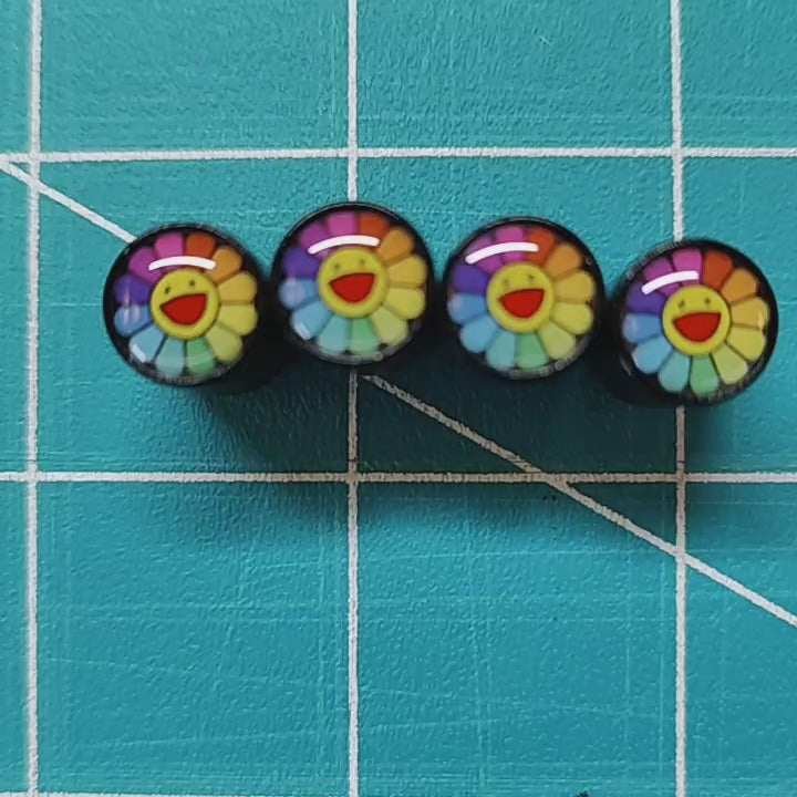 These are brand new Rainbow Daisy Smiley Face Tire Valve Caps - Black Aluminum - Set of Four. They are made to fit any Schrader valve stem (Universal), they fit on all vehicles. These rainbow daisy smiley face tire valve caps have an internal neoprene o-ring to protect your valve stem. These valve caps are made of aluminum and black coated. They are rustproof. These rainbow daisy smiley face tire valve caps are easy to install and look great on any wheel. They make great gifts too!