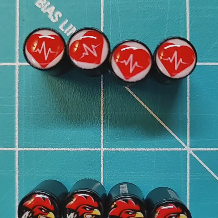 These are brand new Red Heart with Heartbeat Tire Valve Caps - Black Aluminum - Set of Four. They are made to fit any Schrader valve stem (Universal), they fit on all vehicles. These red heart with heartbeat line valve caps have an internal neoprene o-ring to protect your valve stem. Made of aluminum, black coated. Valve caps are rustproof. These red heart with heartbeat line valve caps are easy to install and look great on any wheel. Need red heart gifts? These red hearts valve caps make a great gift for any red heart lover.