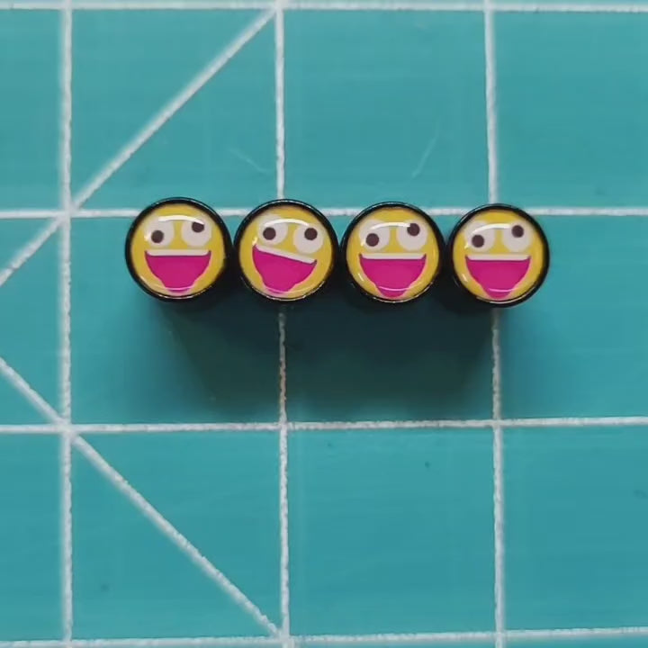 These are brand new Silly Funny Face Tire Valve Caps - Black Aluminum - Set of Four. They are made to fit any Schrader valve stem (Universal), they fit on all vehicles. These silly funny face tire valve caps have an internal neoprene o-ring to protect your valve stem. These valve caps are made of aluminum and black coated. They are rustproof. These silly funny face tire valve caps are easy to install and look great on any wheel. They make great gifts too!