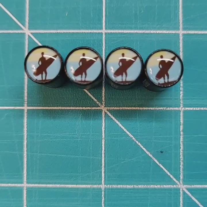 Surfer and Surfboard Tire Valve Caps - Black Aluminum - Set of Four