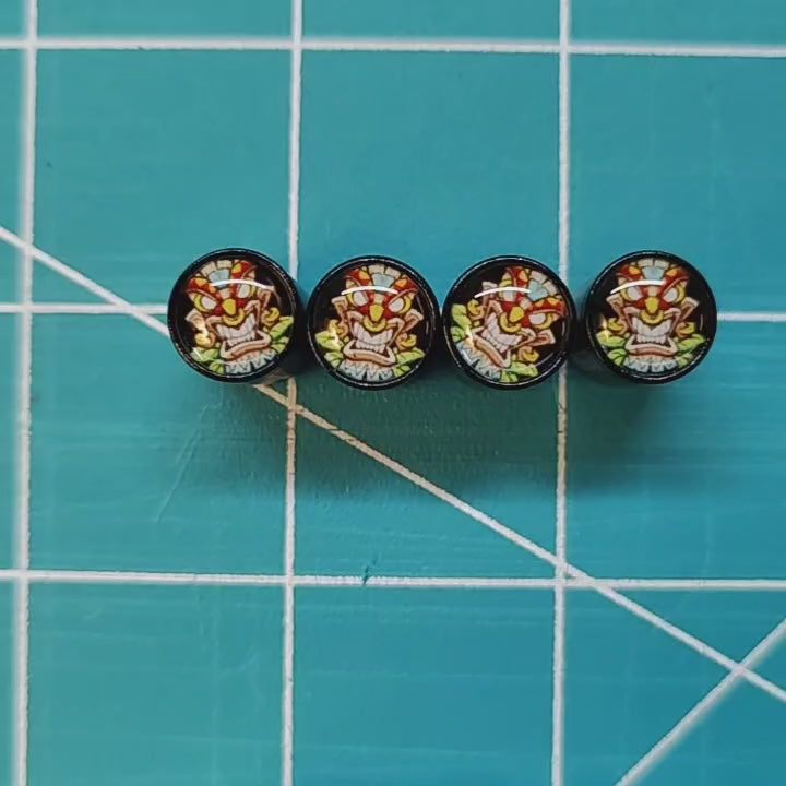 These are brand new Tiki Mask (Style 6) Tire Valve Caps - Black Aluminum - Set of Four. They are made to fit any Schrader valve stem (Universal), they fit on all vehicles. These tiki mask valve caps have an internal neoprene o-ring to protect your valve stem. Made of aluminum, black coated. Valve caps are rustproof. These tiki mask valve caps are easy to install and look great on any wheel. Need tiki mask gifts? These tiki mask valve caps make a great gift for any tiki mask lover.
