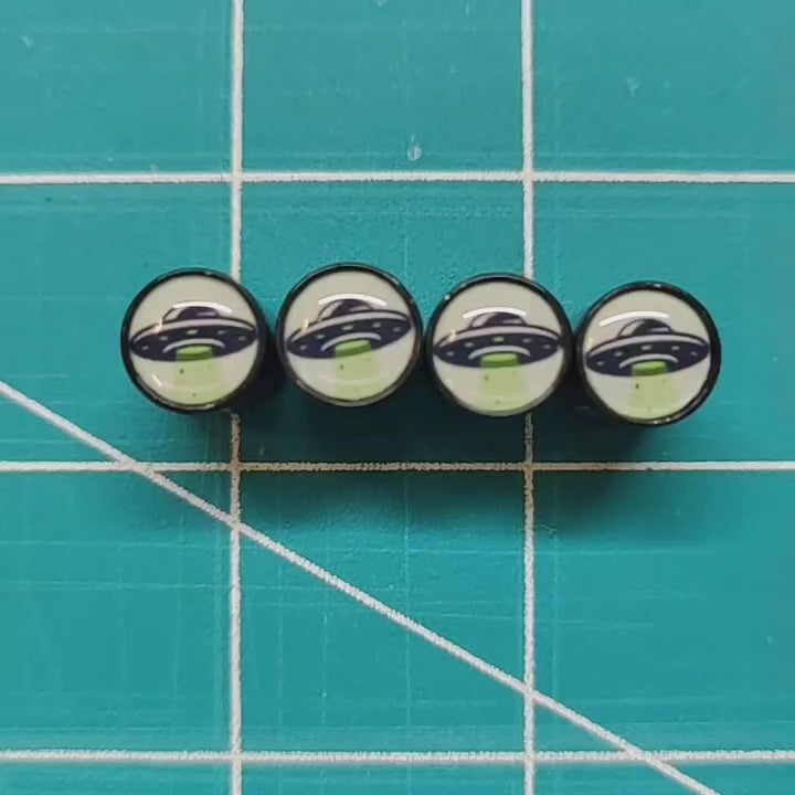 Aliens are coming...it's a flying saucer! Add a cosmic touch to your vehicle with these UFO Flying Saucer Tire Valve Caps! Made of aluminum and black coated, these ufo tire valve caps are rustproof and fit any Schrader valve stem (Universal). They also have an internal neoprene o-ring to protect your valve stem. They are easy to install and perfect for any vehicle. Need ufo gifts? These make a great gift for any ufo believer.