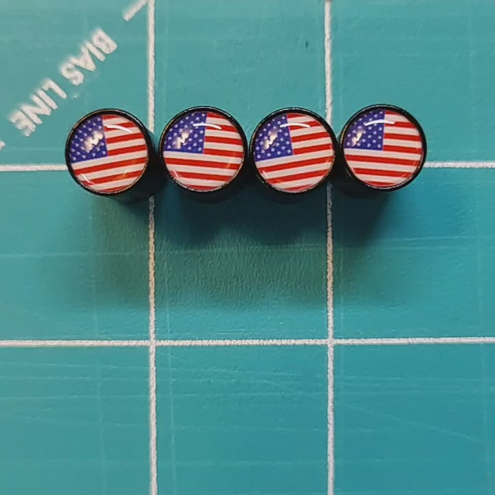 These are brand new America USA Flag Tire Valve Stem Caps - Black Aluminum - Set of Four. They are made to fit any Schrader valve stem (Universal), they fit on all vehicles. These USA Flag Valve Caps have an internal neoprene o-ring to protect your valve stem. Made of aluminum, black coated. Valve caps are rustproof. They are easy to install and perfect for any vehicle. Need USA Flag gifts? These America Flag Valve Caps make a great gift for anyone who loves the USA!