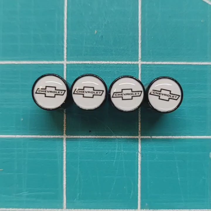 These Vintage 1964 Chevrolet Chevy Tire Valve Caps are a unique find. Made of black aluminum, they are rustproof and feature an internal neoprene o-ring to protect your valve stem. The set of four caps fit any Schrader valve stem, making them universal for all vehicles.
